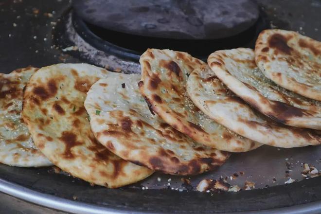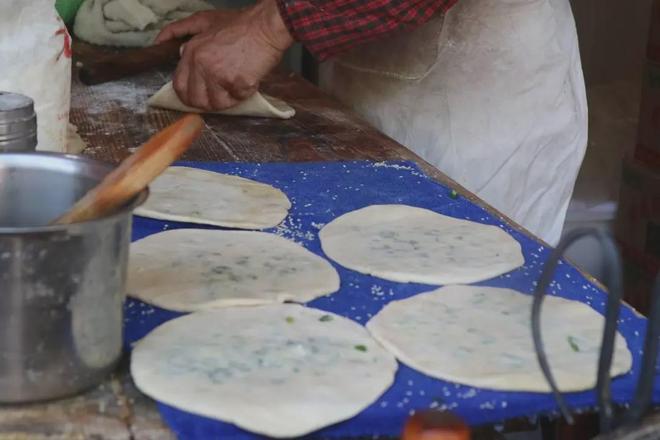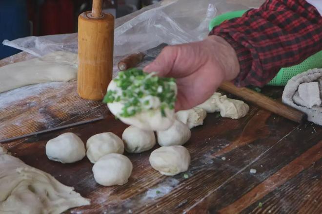 又韧又松的面粉,经过精心揉制和发酵,包裹上满满的葱油馅料,刷上一层猪油烤制,等待出炉的过程中就能闻到白芝麻香和葱花猪油香,还听得到滋滋作响。经过高温烤制的葱油香味儿爆开来,轻轻咬下,饼皮的酥脆与内馅的咸香在舌尖上交织缠绵。