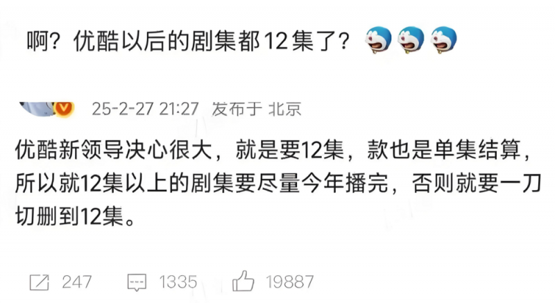前不久,有自媒体博主发文称“优酷新领导决心很大,剧集就是要12集,12集以上的剧集要尽量今年播完,否则就要一刀切删到12集”。